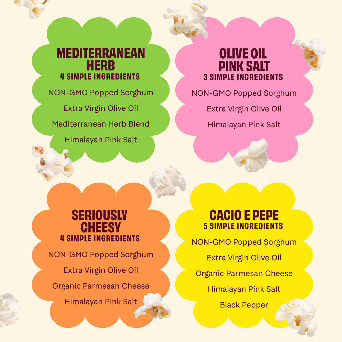 - Flavors include: Mediterranean Herb, Olive Oil & Pink Salt, Seriously Cheesy, and Cacio e Pepe