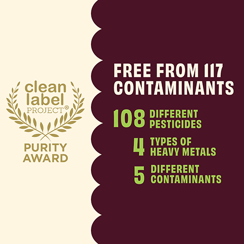 - Won the Purity Award from Clean Label Project - no pesticide residue, no heavy metals, no BPA